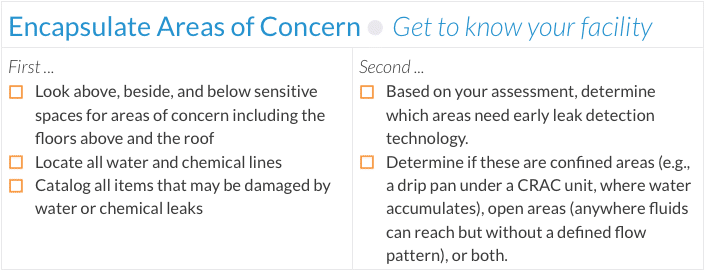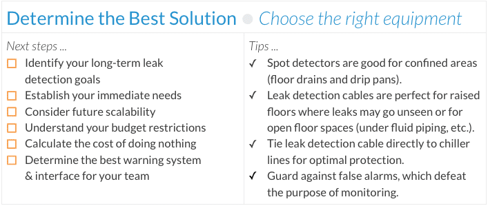 Start by thinking about the big picture of what you want your leak detection to accomplish. What are the big things that can be affected by potential fluid damage? Do you want to reduce risk? Increase facility uptime? Ensure that the resources you provide your customers are always available? Reduce insurance costs?
