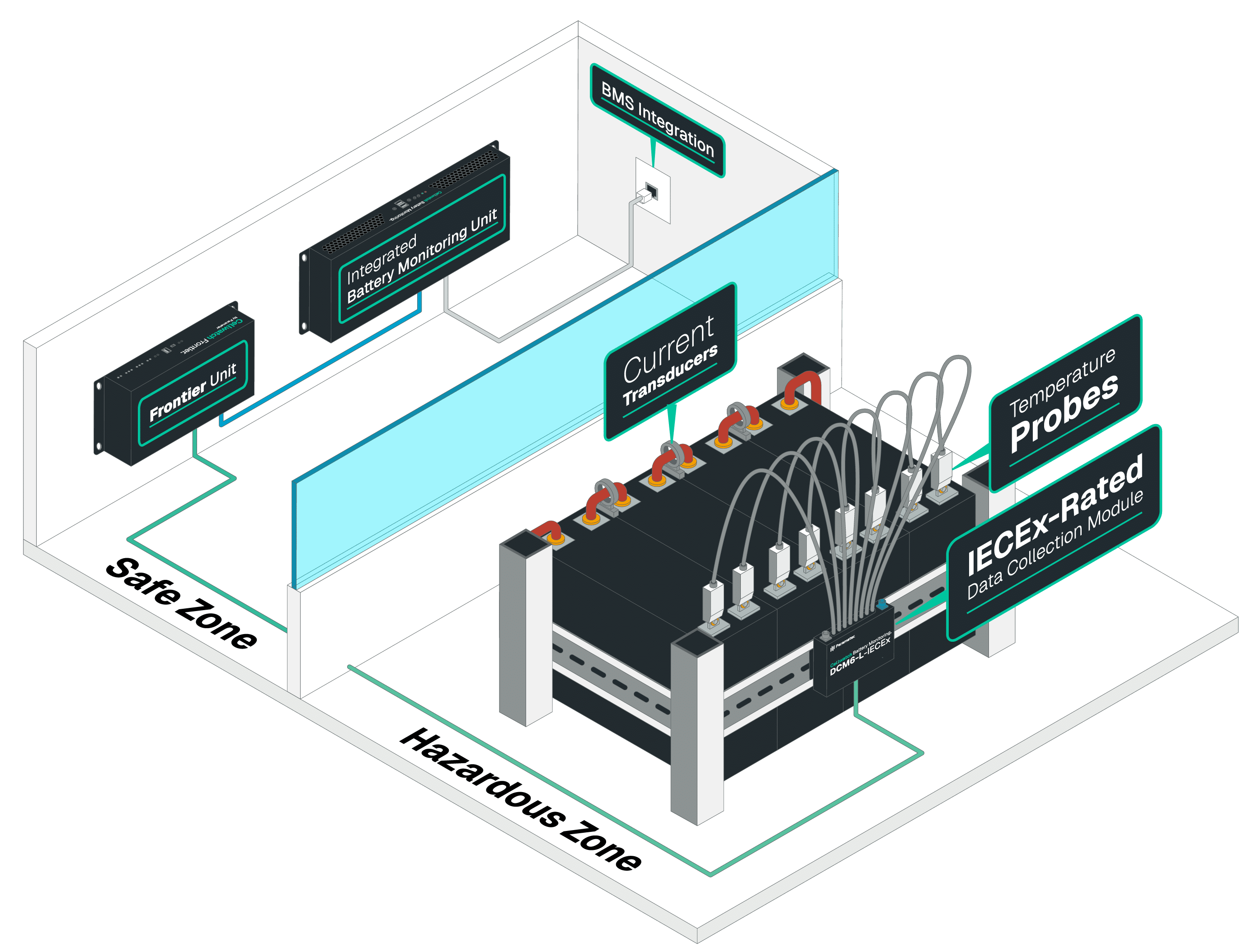 Our IECEx-Certified Data Collection Module (DCM) is installed inside the hazardous zone. Each DCM monitors up to four cells, is small enough to mount on a DIN-rail, and comes with optional temparature probes that come certifed with the unit.